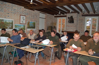 - Déontologie et techniques d’intervention : comportement du garde dans l’exercice de ses fonctions, communication et présentation. Ce dernier point fait l’objet, au cours du 2ème après-midi, de « jeux de rôles » avec mise en situations concrètes de contrôles et de cas d’infractions à la police de la chasse. Une rédaction de PV est ensuite étudiée en salle à partir d’un cas vécu sur le terrain. Différents documents pouvant aider ensuite les gardes au cours de leurs activités, sont remis sous forme informatique à ceux qui sont équipés de ce type de matériel.